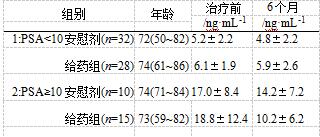 隨機(jī)將85例受試者分成兩組進(jìn)行雙盲試驗(yàn),根據(jù)受試者血中PSA水平,以10 ng/mL為界分成2組。1組(PSA≤10 ng/ mL):安慰劑32例,給藥28例;2組(PSA>10 ng/mL):安慰劑10例,給藥15例,試驗(yàn)6個(gè)月。2組給藥的15例其PSA顯著下降,由治療前的(18.8±12.4) ng/mL降至治療后的(10.2±6.2) ng/mL,見(jiàn)表2。表明姜黃素和大豆異黃酮能通過(guò)抗雄激素作用,抑制前列腺細(xì)胞中PSA產(chǎn)生,調(diào)節(jié)血中PSA水平。